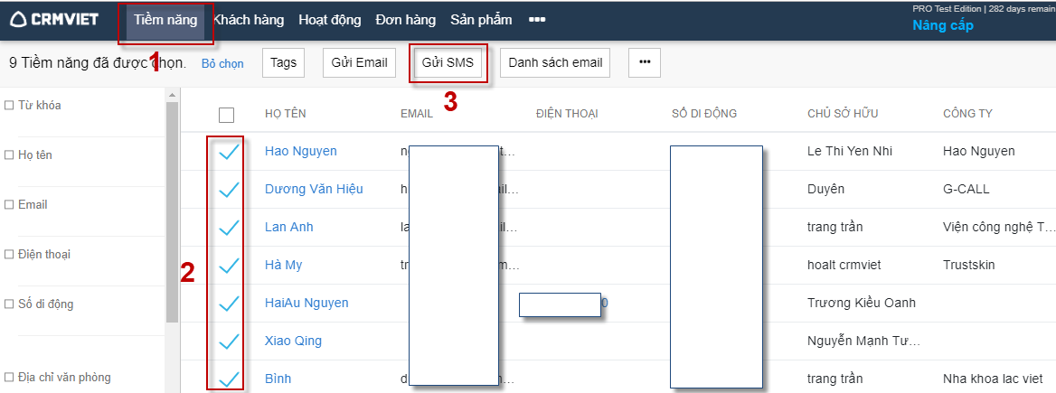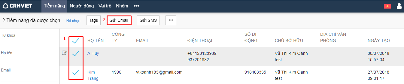 Bước 1: Tiềm năng -> Tích chọn tiềm năng cần gửi SMS (trong danh sách tiềm năng được chọn phải có ít nhất một tiềm năng có số di động) -> Gửi SMS