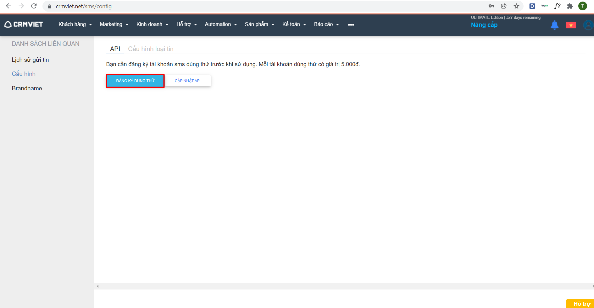 - Khi khách hàng đăng kí dùng thử SMS sẽ có 5.000 trong tài khoản và chỉ gửi SMS theo brandname CSKH (gửi thử tối đa 5 tin nhắn theo brandname CSKH)