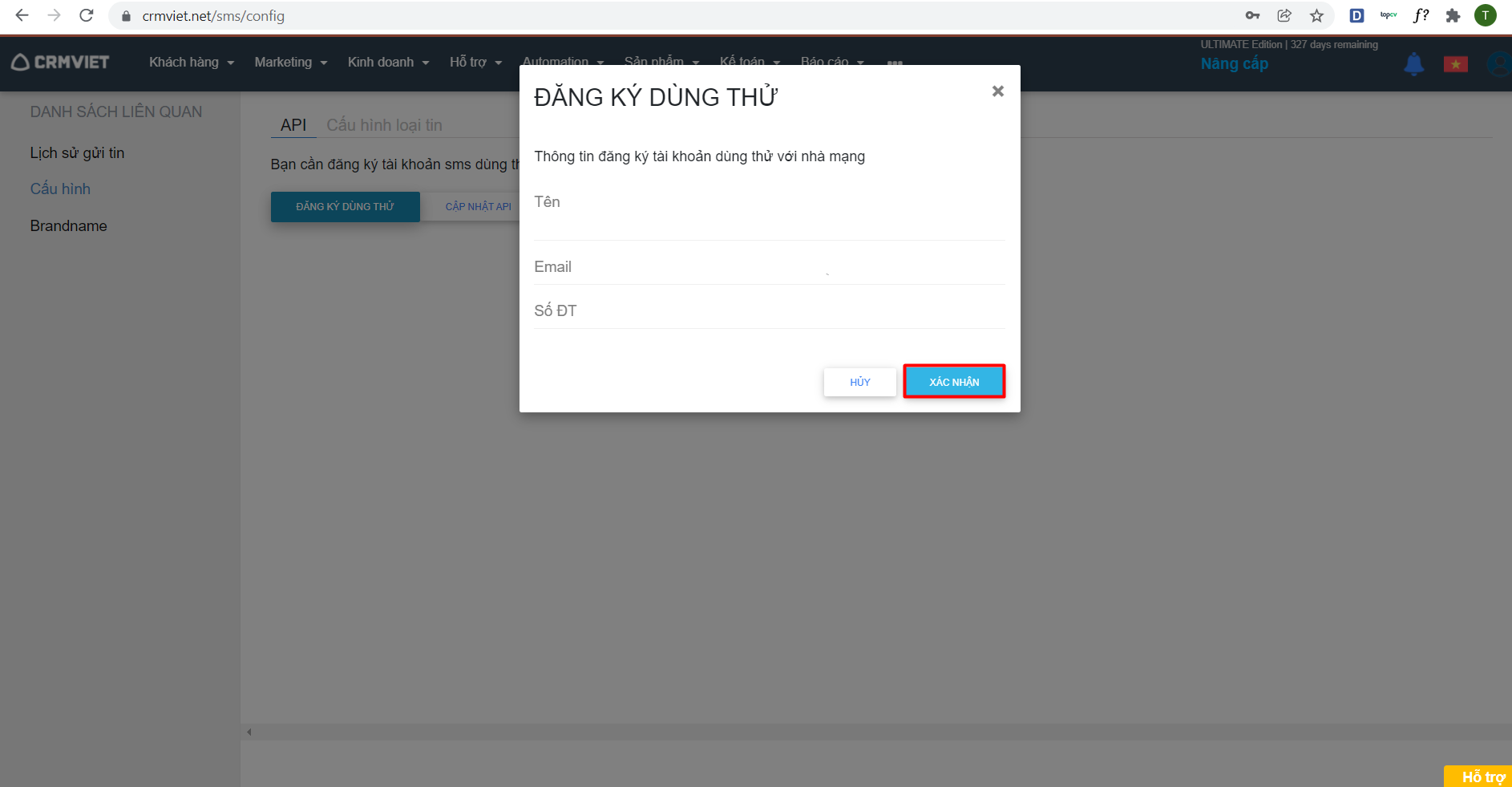 Bước 3: Hiển thị Tên , email, số điện thoại của người dùng đăng kí dùng thử – > Chọn Xác nhận