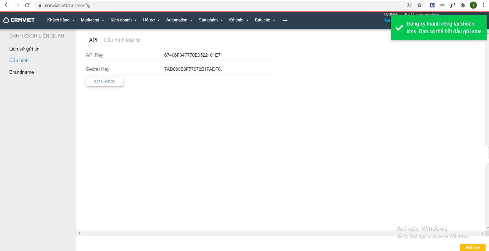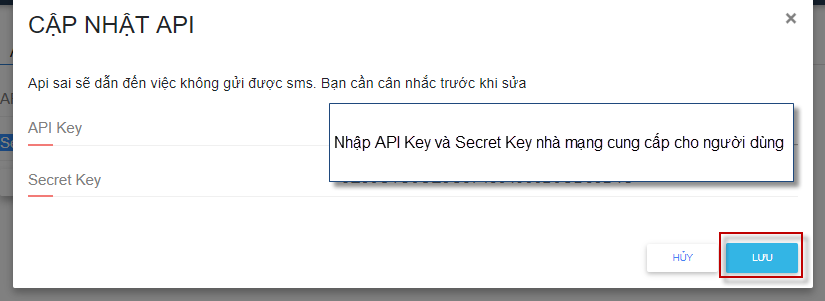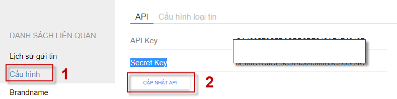 Khi đăng kí brandname thành công, nhà mạng sẽ cung cấp cho API Key và Secret Key, người dùng vui lòng nhập nhập các thông tin vào trên phần mềm theo hướng dẫn sau