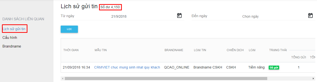 Người dùng có thể kiểm tra tài khoản gửi sms ở Số dư trong Lịch sử gửi tin
