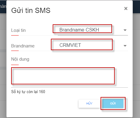 Bước 3: Chọn loại tin nhắn-> Chọn Brandname-> Nhập Nội dung -> Nhấn nút Gửi