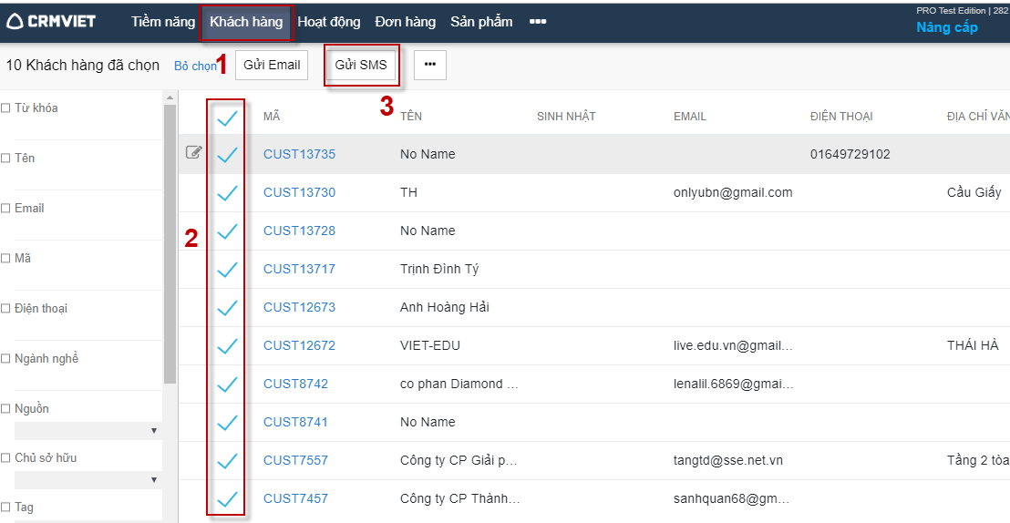 Bước 1: Khách hàng -> Tích chọn khách hàng cần gửi -> Gửi SMS