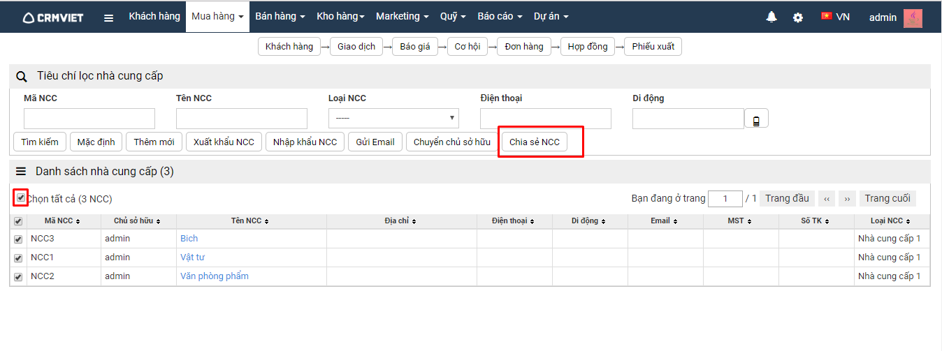 Cách thực hiện : Vào ” Mua hàng ” chọn ” Nhà cung cấp “. Sau khi click vào nút , sau đó chọn ” Chia sẻ NCC ”