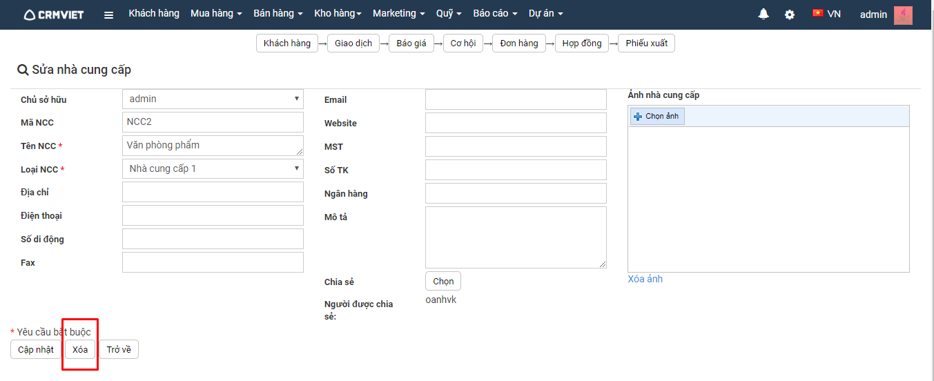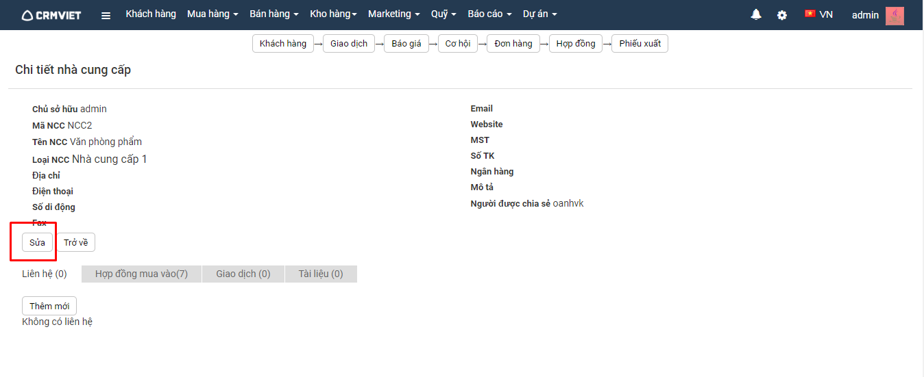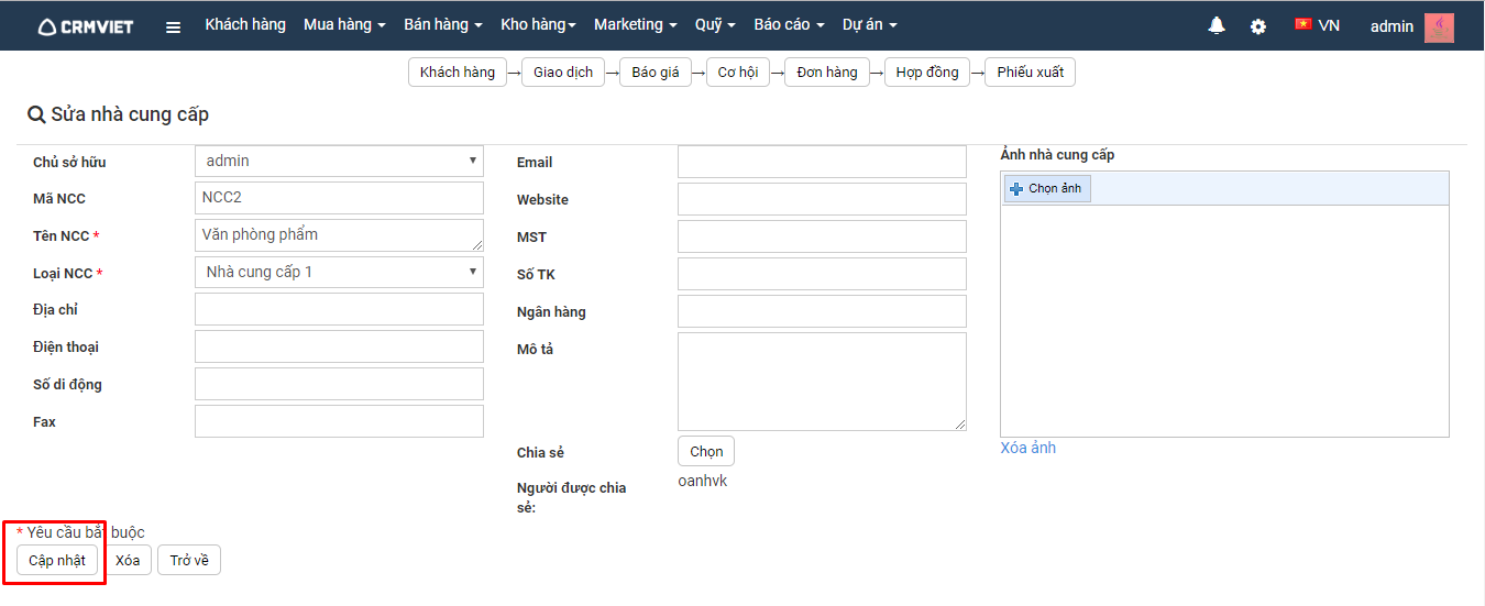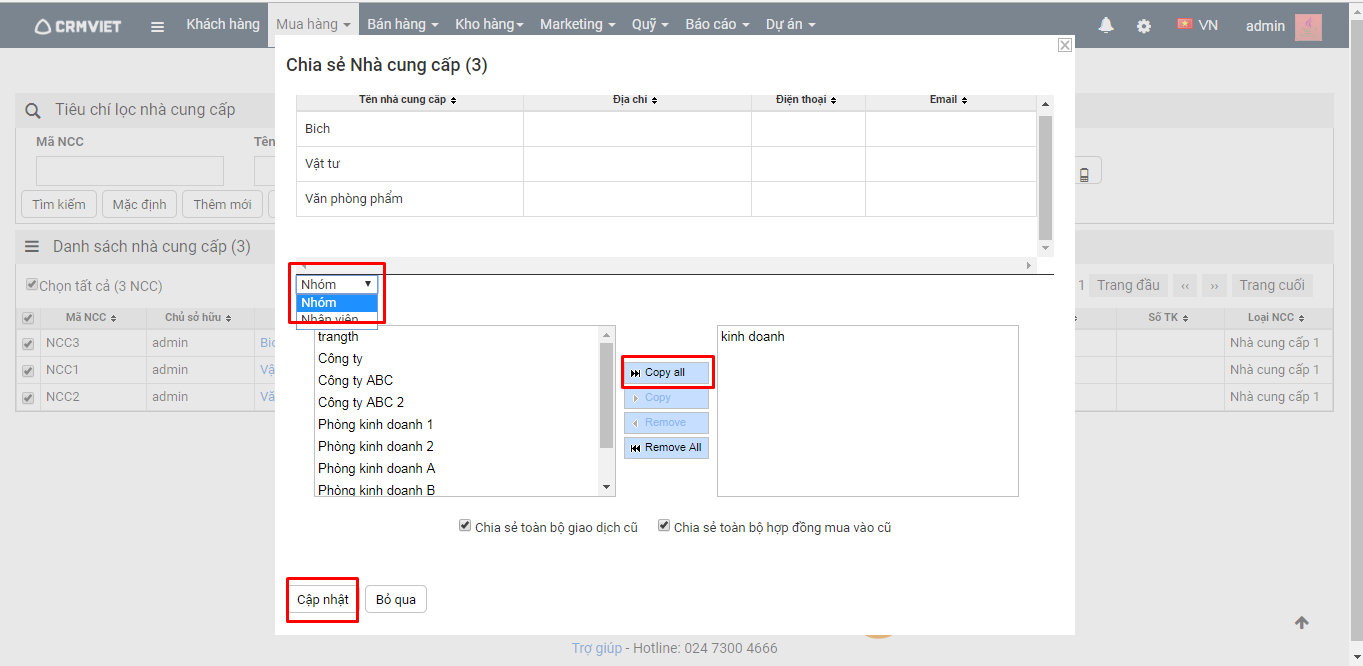 Sau đó tích vào các thông tin chi tiết của nhà cung cấp muốn chuyển chọn và chọn nhân viên đươc nhận . Chọn ” cập nhật ”
