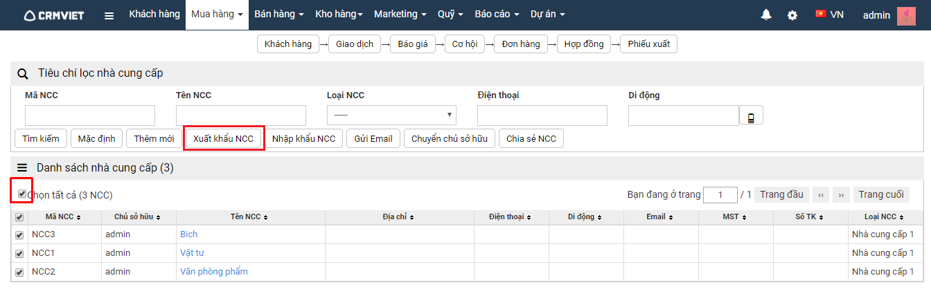 Chọn ” Xuất khẩu nhà cung cấp” để vào màn hình