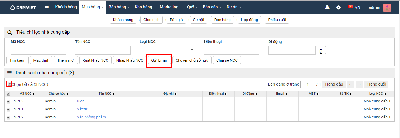B1: Chọn Mua hàng -> Chọn Nhà cung cấp