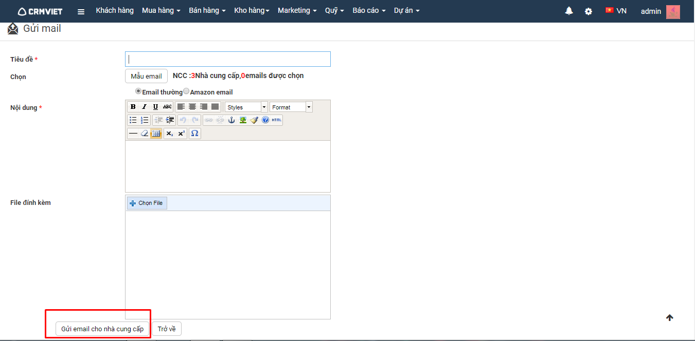 Điền tiêu đề, nội dụng hoặc file đính kèm sau đó chọn ” Gửi email cho nhà cung cấp”