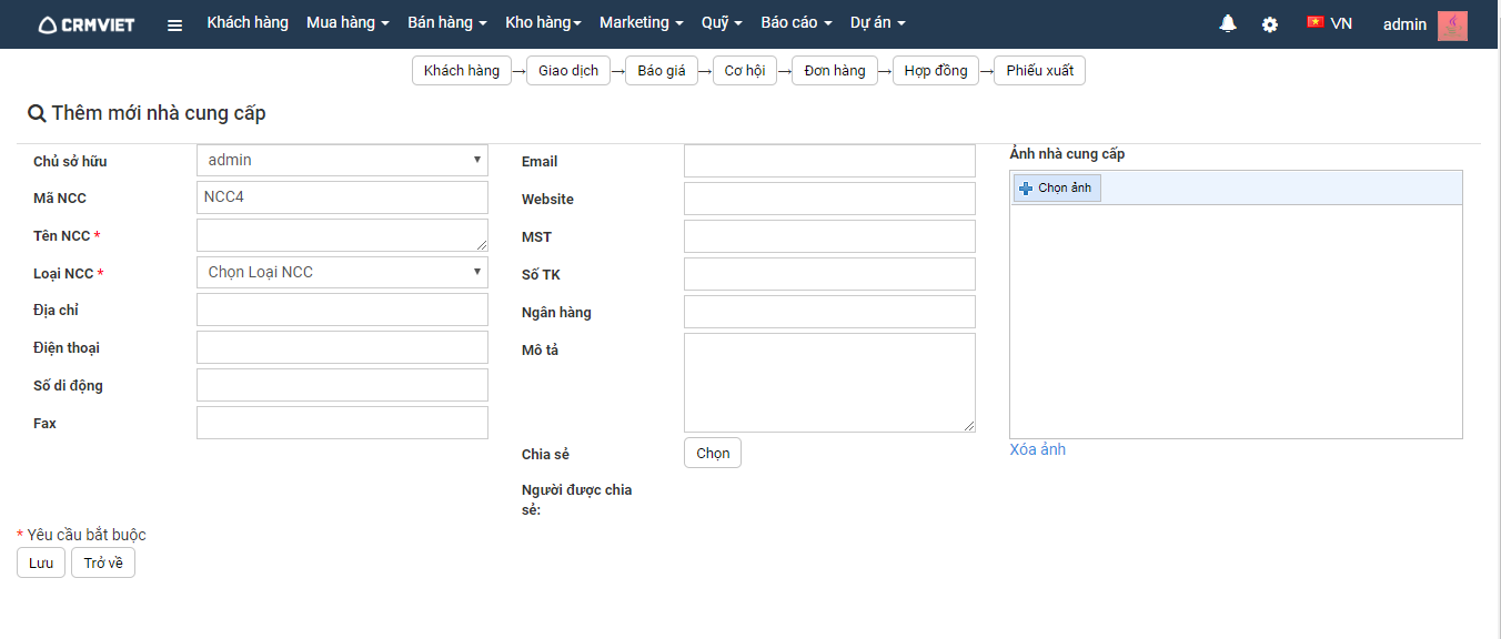 B3: Chọn Lưu để lưu thông tin nhà cung cấp hoặc chọn Trở về để không lưu thông tin nhà cung cấp và trở về trang trước