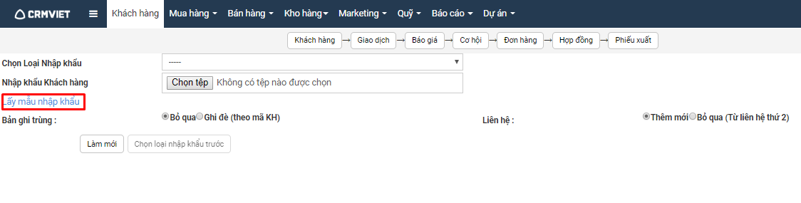 Nhập khẩu theo mẫu là giữ nguyên file excel nhập khẩu khách hàng chỉ điền thông tin khách hàng, trường nào không sử dụng thì bỏ trống.