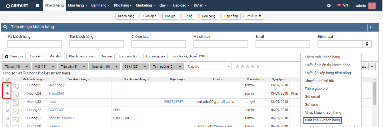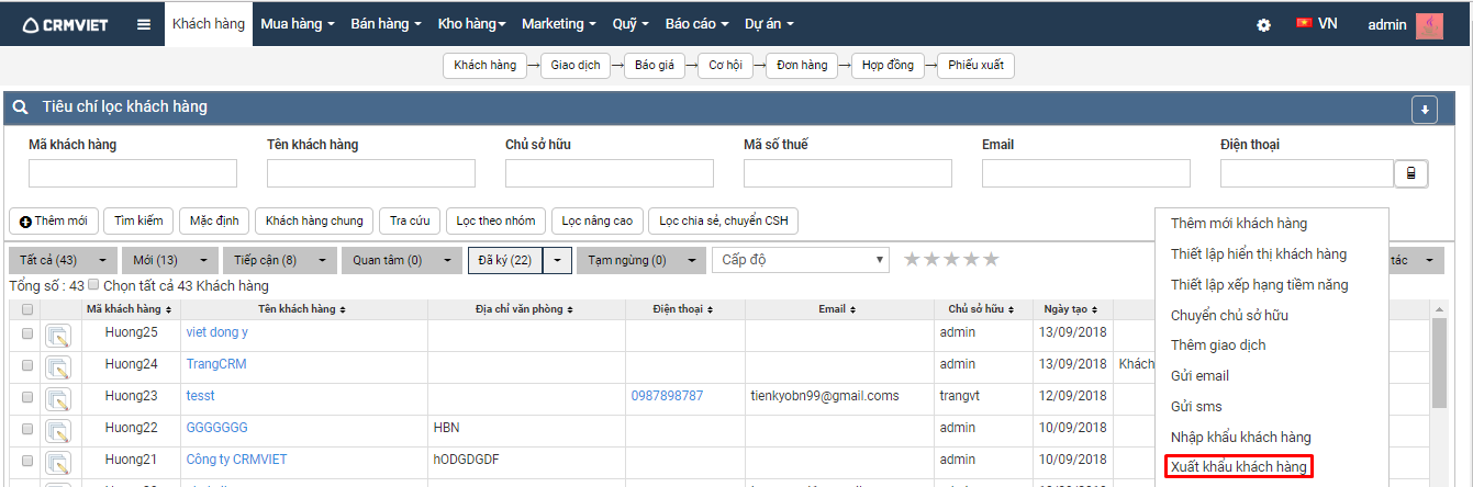 Vào module khách hàng – Chọn Thao tác – Chọn Xuất khẩu khẩu khách hàng – Toàn bộ khách hàng trên hệ thống sẽ được xuất khẩu ra file excel