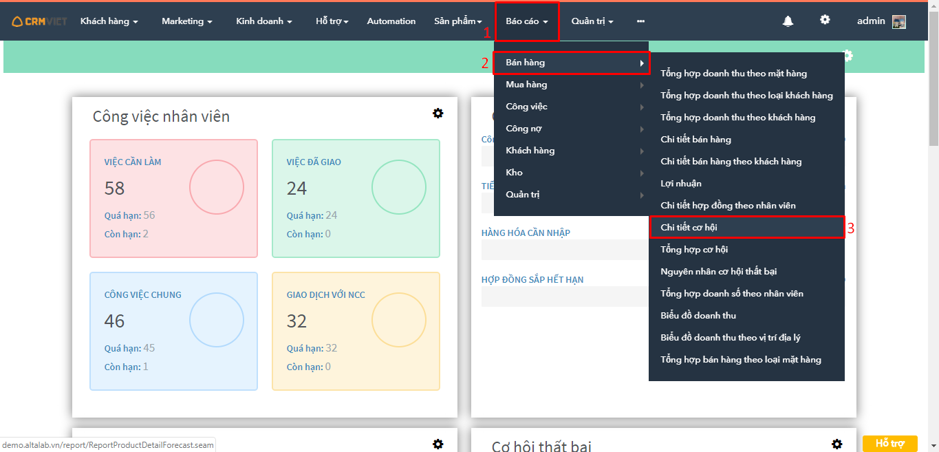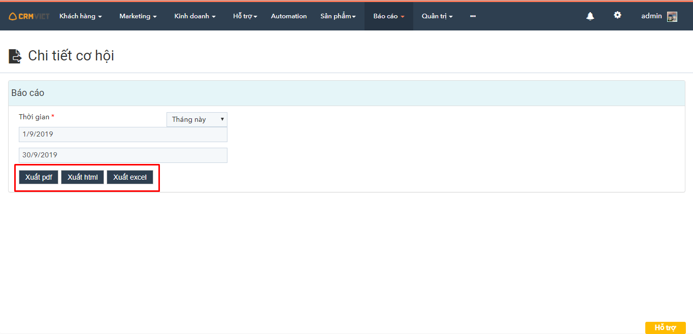 Để xuất báo cáo chi tiết cơ hội, người dùng thực hiện các thao tác sau: