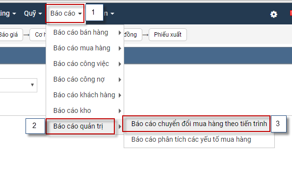 Bước 1: Báo cáo -> Báo cáo quản trị -> Báo cáo chuyển đổi mua hàng theo tiến trình
