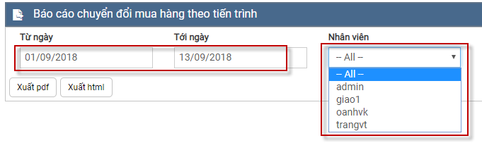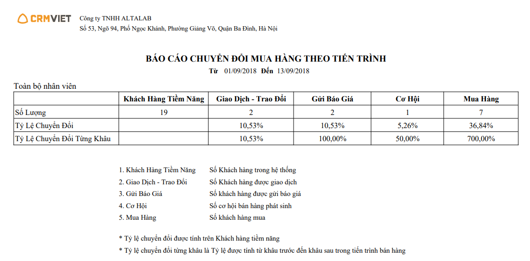 Báo cáo chuyển đổi mua hàng theo tiến trình là báo cáo tổng hợp số lượng khách hàng, giao dịch, báo giá, cơ hội và số khách hàng có mua hàng trong khoảng thời gian đó.