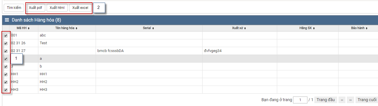 Bước 3: Tích chọn hàng hóa cần để xuất báo cáo -> Chọn định dạng để xuất báo cáo