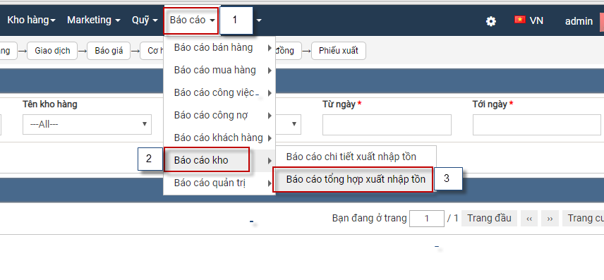 Bước 1: Báo cáo -> Báo cáo kho -> Báo cáo tổng hợp xuất nhập tồn