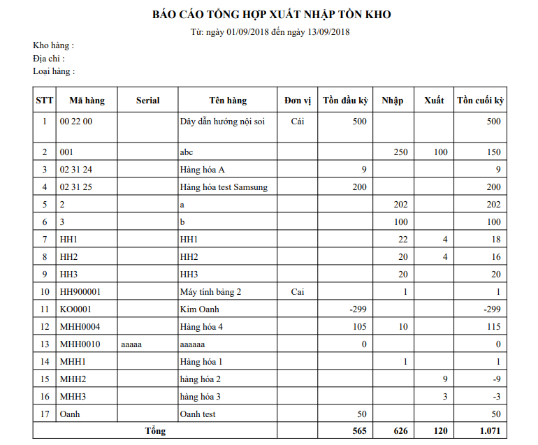 Báo cáo xuất nhập tồn là báo cáo tổng hợp số lượng hàng hóa tồn kho, tổng số lượng hàng hóa nhập, xuất theo thời gian nhập, xuất hàng hóa.