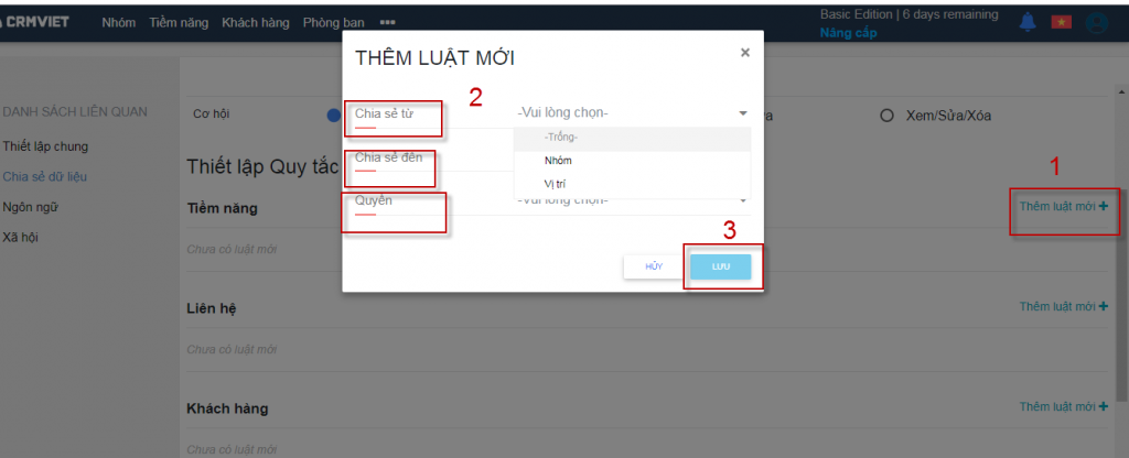 – Các bước: Chọn ” Thêm luật mới” -> màn hình hiển thị popup-> chọn chia sẻ từ vị trí hoặc nhóm -> vị trí hoặc nhóm. Tiếp đến chọn quyền ( Chỉ Xem, Xem/Sửa, Xem/ Sửa/Xóa) muốn chia sẻ cho người được chia sẻ dữ liệu -> Lưu.
