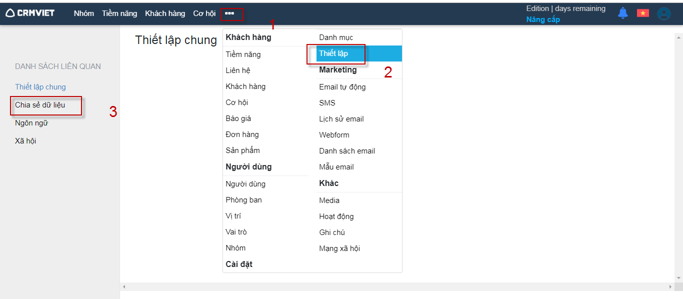 – Người dùng chọn module mà muốn chia sẻ dữ liệu. Ví dụ ở đây là muốn chia sẻ thông tin tiềm năng, người dùng thực hiện theo thao tác hình 3