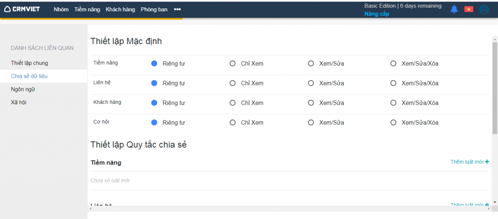 -> Lưu ý: Khi sử dụng các chức năng ở chế độ mặc định này thì bất cứ trường hợp nào cấp trên cũng có toàn quyền sử lý dữ liệu với cấp dưới. Thường chúng ta sẽ để chế độ mặc định là ” riêng tư” để đảm bảo dữ liệu của người dùng