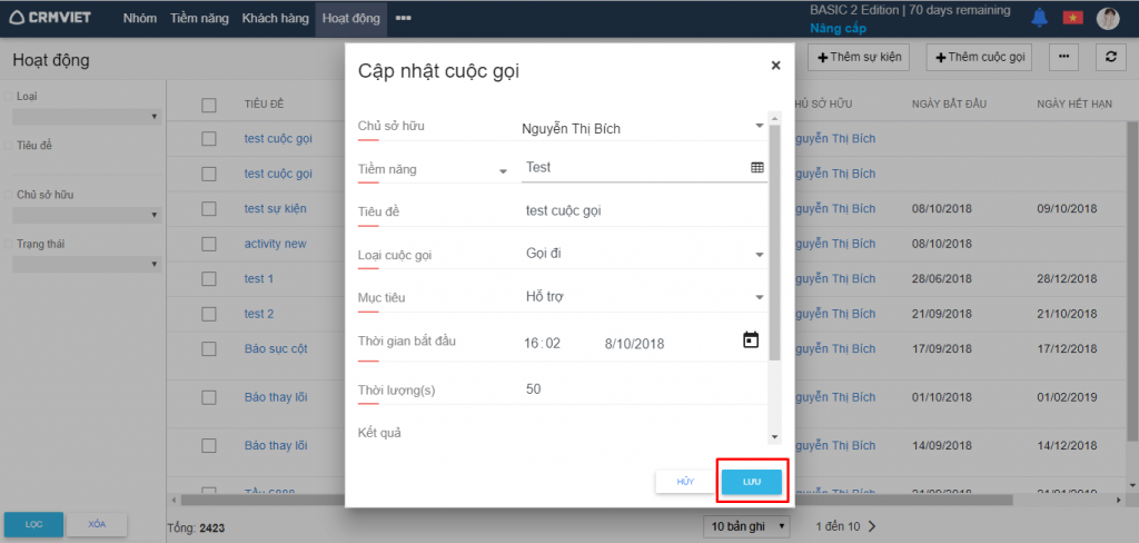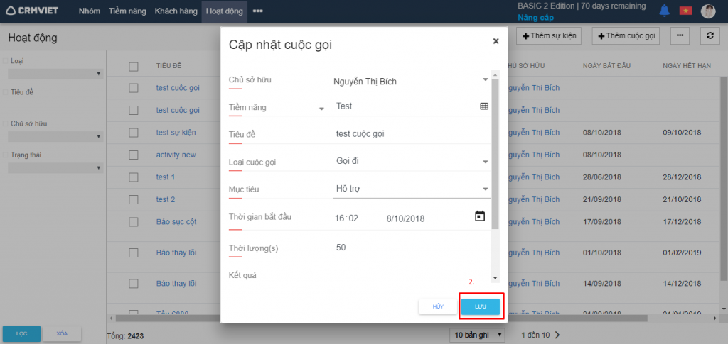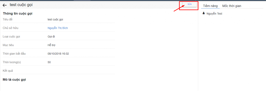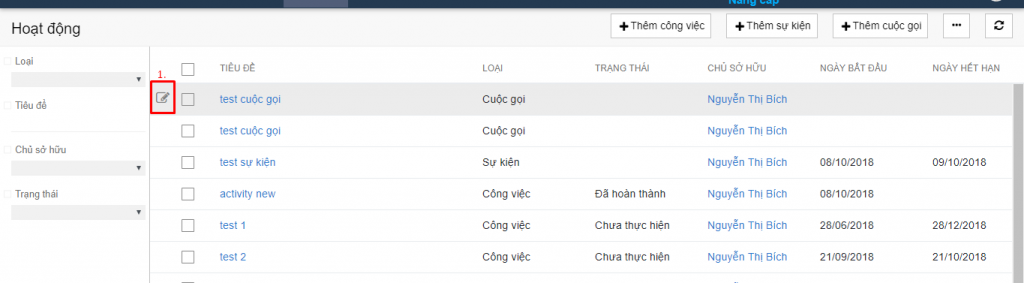 Thao tác để sửa cuộc gọi: Danh sách hoạt động -> click chọn biểu tượng edit cạnh check box cuộc gọi cần sửa –> Sau đó nhập thông tin cần sửa rồi nhấn nút Lưu (Hình 1,2)