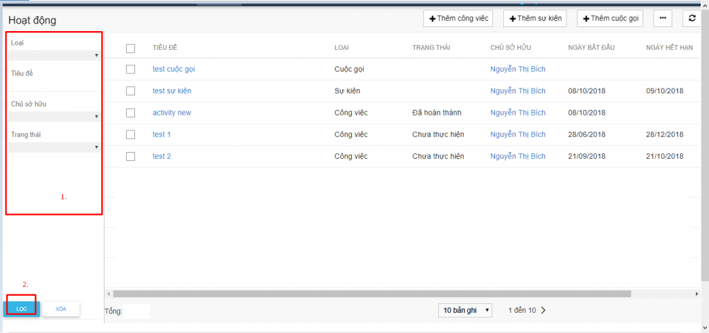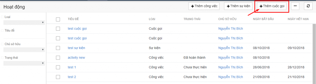 Tìm kiếm , lọc dữ liệu theo thông tin các trường của Cuộc gọi ( Bao gồm tìm kiếm theo: Loại, tiêu đề, chủ sở hữu, trạng thái)