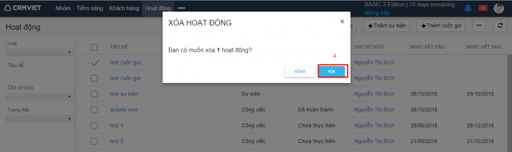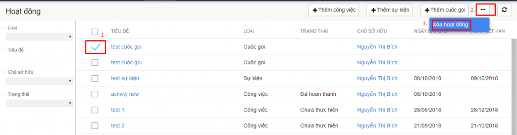 Thao tác để xóa sản phẩm: Danh sách hoạt động-> Tích chọn cuộc gọi cần xóa -> click chọn nút More -> Click chọn Xóa hoạt động để xóa -> Xuất hiện pop up xác nhận xóa -> click chọn Xóa để xóa & click chọn Hủy để không xóa. (Hình 1,2)
