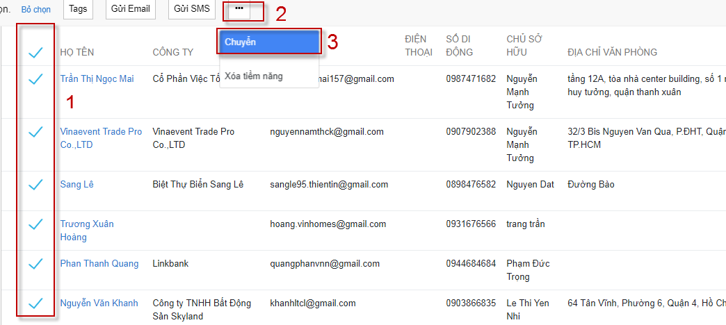 Bước 1: Từ màn hình danh sách Tiềm năng -> Người dùng trỏ chuột đến vị trí Tiềm năng-> Tích chọn Tiềm năng -> Chọn biểu tượng