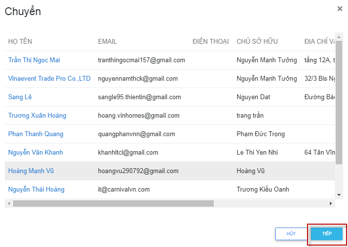 Bước 2: Hiển thị lên danh sách khách hàng đã chọn -> Nhấn nút Tiếp