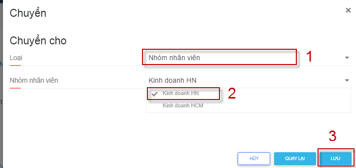 - Chuyển theo nhóm: Chọn Nhóm nhân viên -> Tích chọn Nhóm nhân viên -> Nhấn nút Lưu