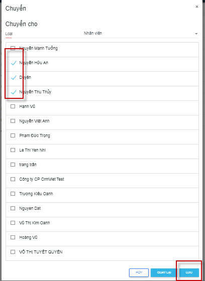 - Chuyển theo nhân viên: Chọn Nhân viên -> Tích chọn Nhân viên -> Nhân nút Lưu