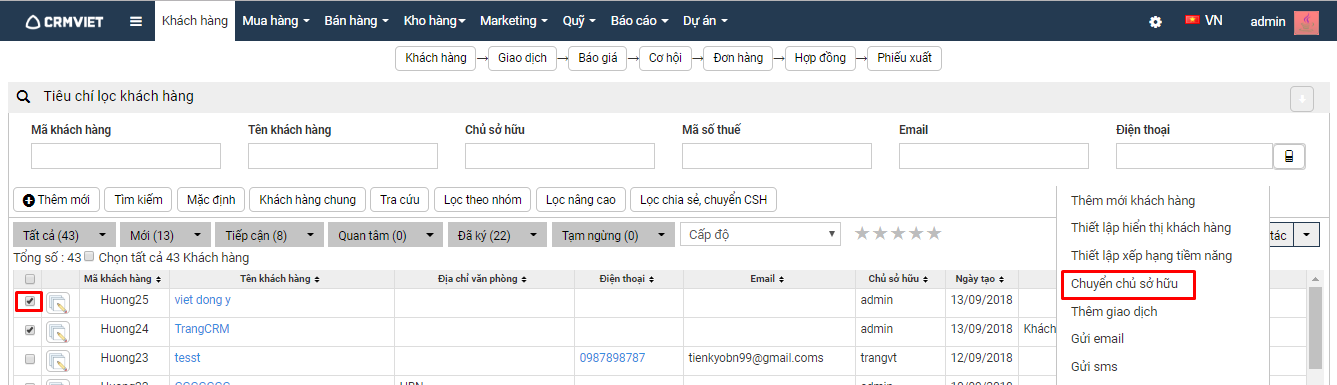 tương ứng với những khách hàng muốn chuyển chủ sở hữu –> Chọn Thao tác – > Chọn Chuyển chủ sở hữu:
