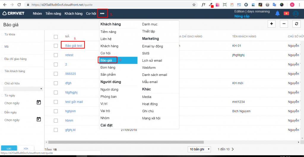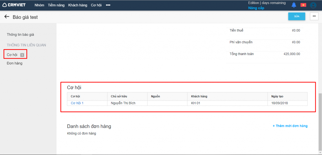 Các bước để xem danh sách cơ hội của 1 báo giá: