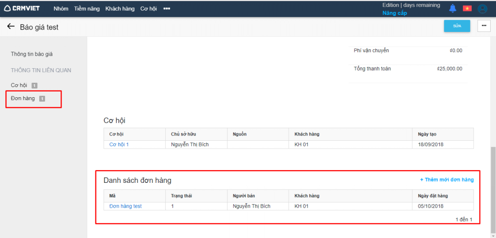 + Khi ta tạo 1 đơn hàng tại module đơn hàng mà lựa chọn mã báo giá nào thì trong chi tiết báo giá đấy sẽ hiển thị thông tin đơn hàng vừa tạo.