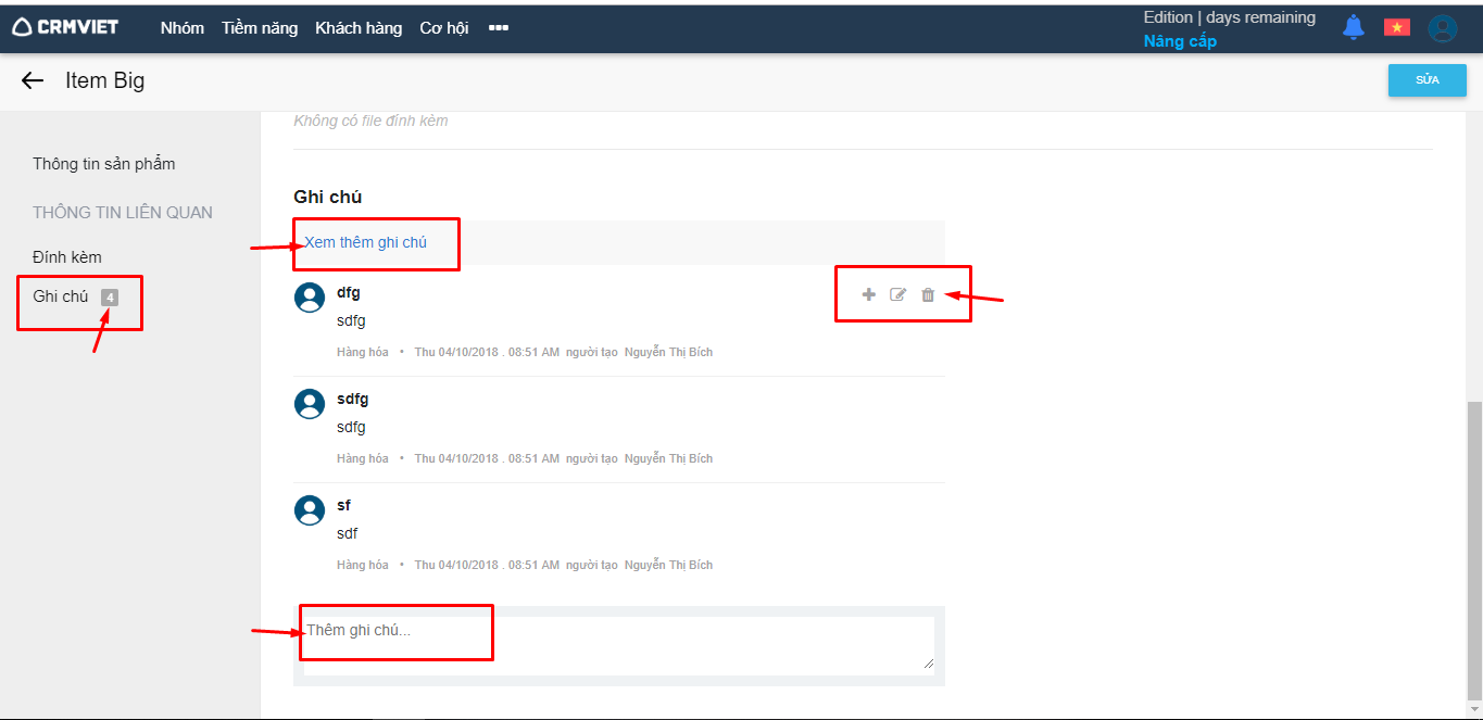 Ghi chú trong CRMVIET được gắn với sản phẩm để người dùng có thể ghi chú lại các thông tin, nhu cầu, tình trạng của từng sản phẩm.