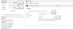 B4.4: Nhập nội dung sms. Nội dung có thể do người tạo tự nhập hoặc chọn mẫu đã có sẵn, trong nội dung sms, có thể đính kèm các trường trộn khác được lấy ở bên tab trường trộn bằng cách click vào “biểu tượng ngón tay”.