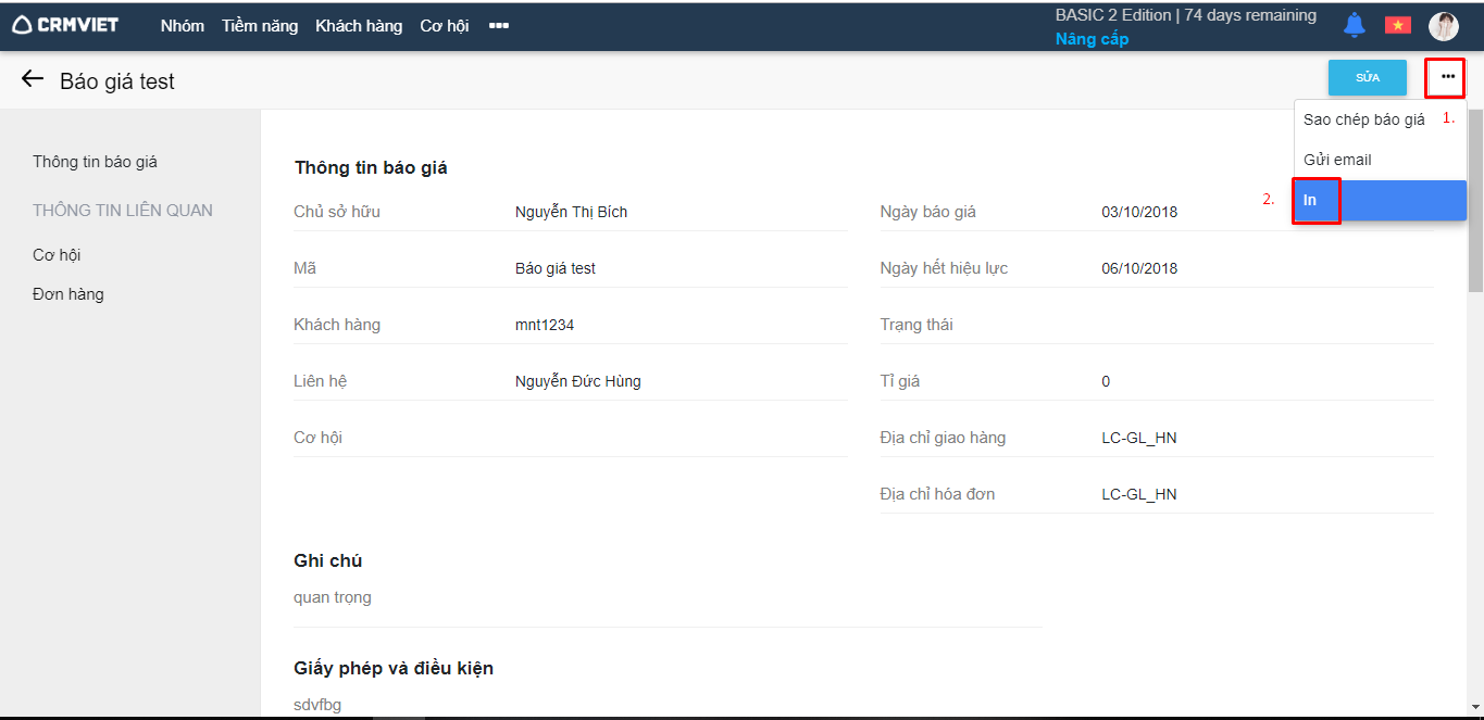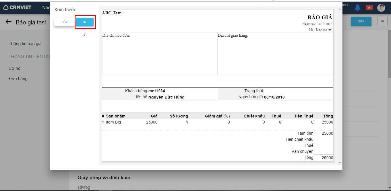 Thao tác để in Báo giá: Tại màn hình danh sách báo giá -> Click chọn vào tên báo giá cần in -> Hiển thị màn hình chi tiết báo giá -> Click chọn nút More -> Click chọn nút In -> Xuất hiện pop up xem trước khi in -> Chọn In để xác nhận in báo giá hoặc chọn Hủy nếu không muốn tiếp tục in báo giá.(Hình 1,2)