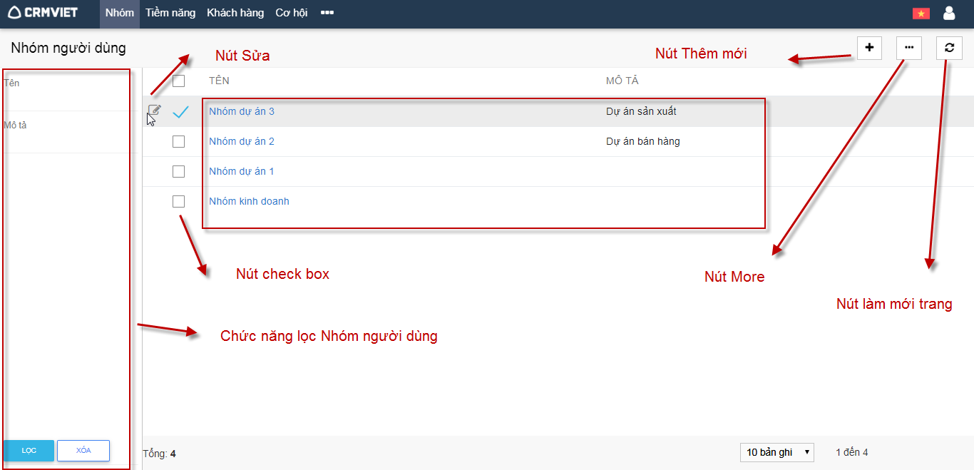Đăng nhập vào tài khoản User–> Click Module “Nhóm”, giao diện hiển thị như hình.