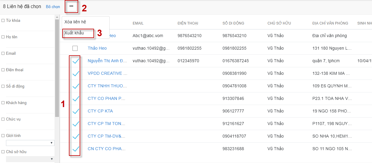 3. 2 Xuất khẩu theo danh sách liên hệ được chọn
