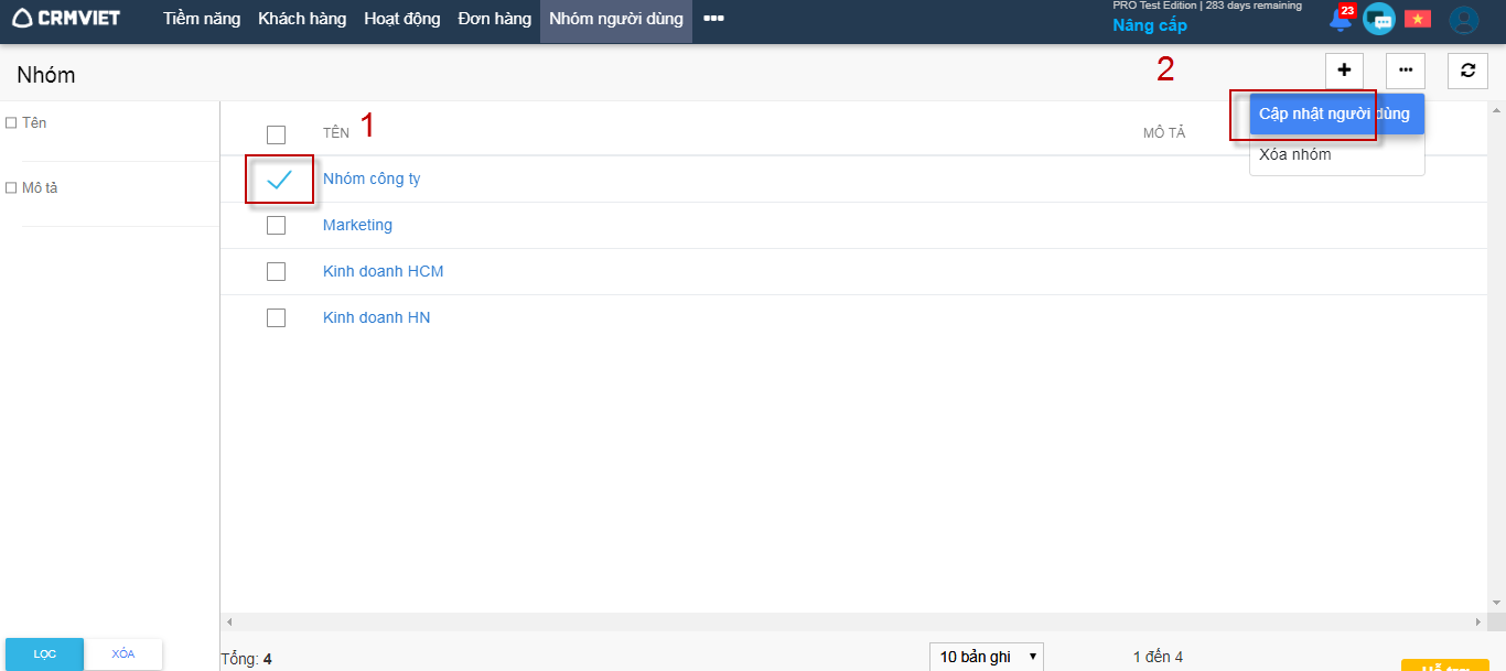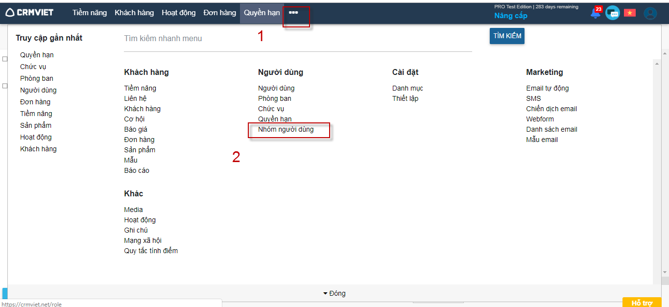 Bước 1: Tại danh sách menu, người dùng click  -> Nhóm người dùng