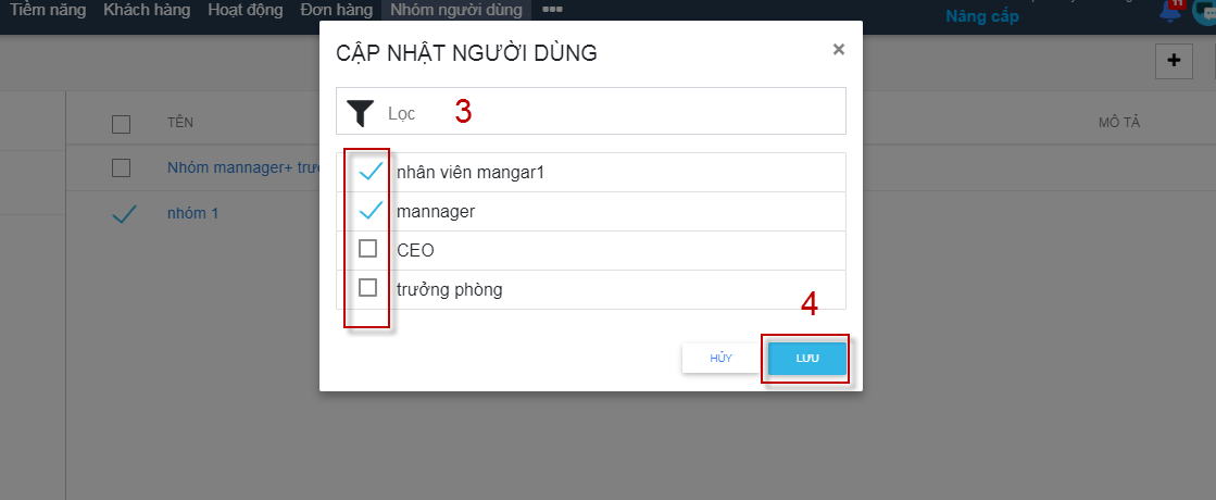 Bước 2: Màn hình hiển thị trang cập nhật người dùng. Người dùng cập nhật bằng cách tích vào ô vuông người muốn thêm vào nhóm -> Lưu. Trong trường hợp danh sách nhiều người dùng có thể click vào ô tìm kiếm để lấy thông tin mong muốn