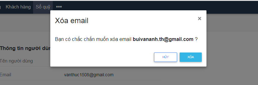 tại email muốn xóa, màn hình hiển thị popup như hình 6–>Kích chọn nút “Xóa” để hoàn tất xóa email khỏi danh sách hoặc kích chọn “Hủy” để hủy bỏ thao tác