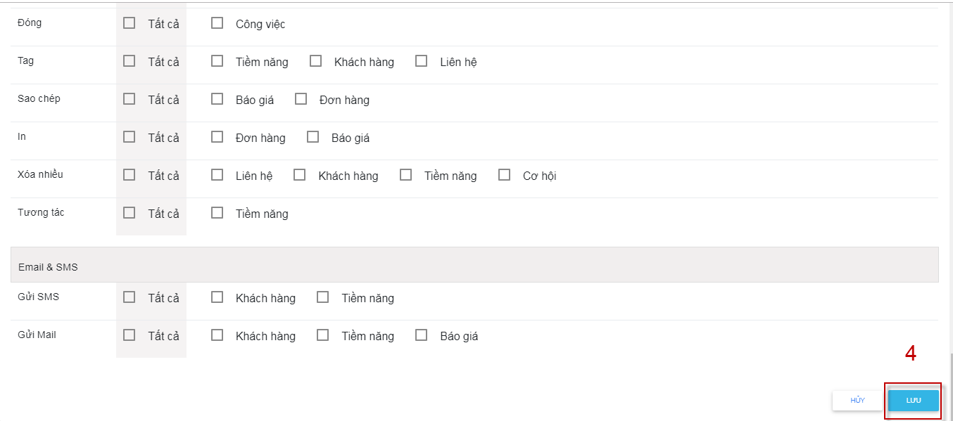 Bước 2: Màn hình hiển thị trang chọn quyền. Người dùng chọn quyền bằng cách click vào từng ô vuông bên cạnh quyền, hình 8 -> Lưu để lưu các thao tác vừa chọn, hình 9