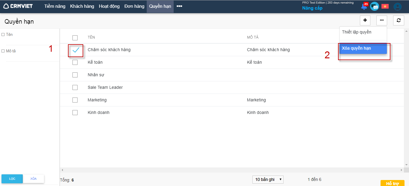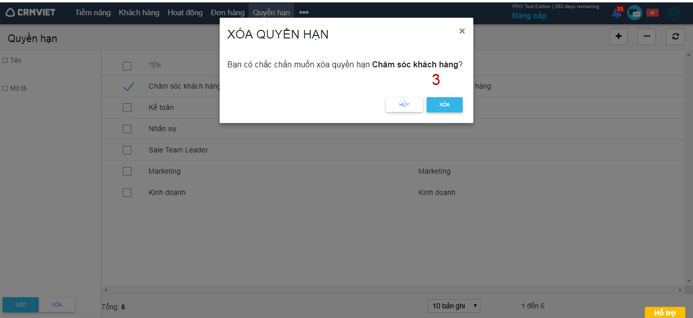 Bước 2: Màn hình hiển thị trang xóa -> click xóa để xóa quyền hạn.