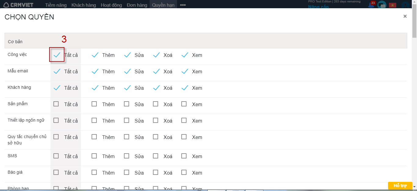 Bước 1: Người dùng click ô vuông cạnh quyền hạn muốn sửa ->