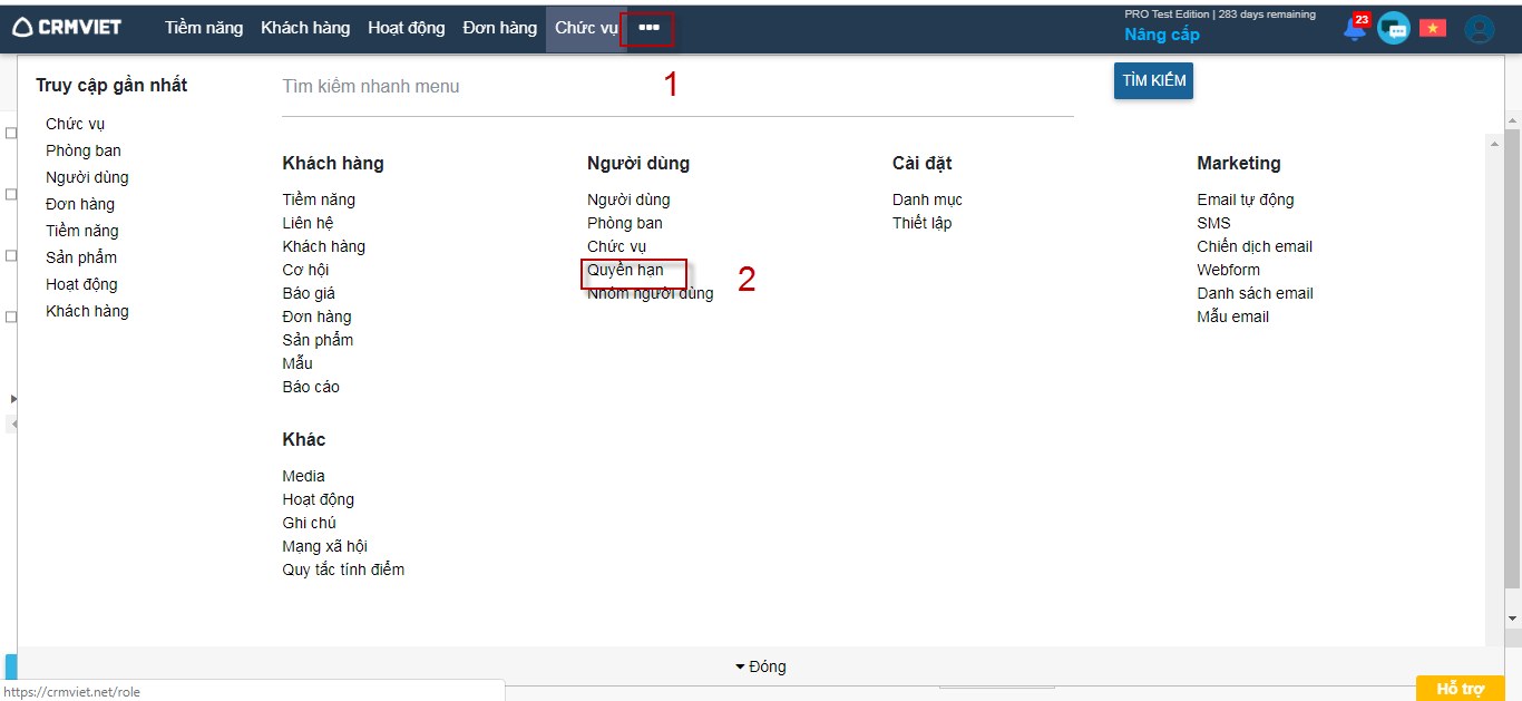 Bước 1: Tại menu người dùng click vào module quyền hạn