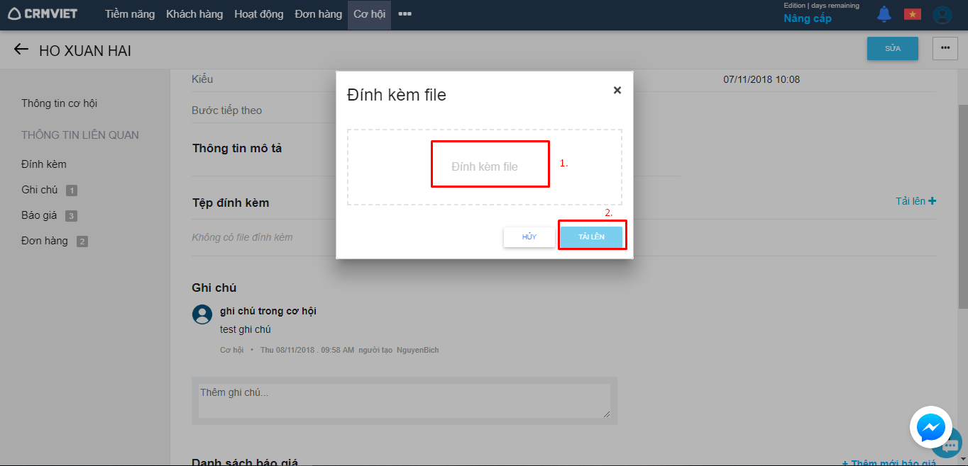 Bước 1: Tại module cơ hội -> Chọn cơ hội cần tải lên file đính kèm(Hình 1)