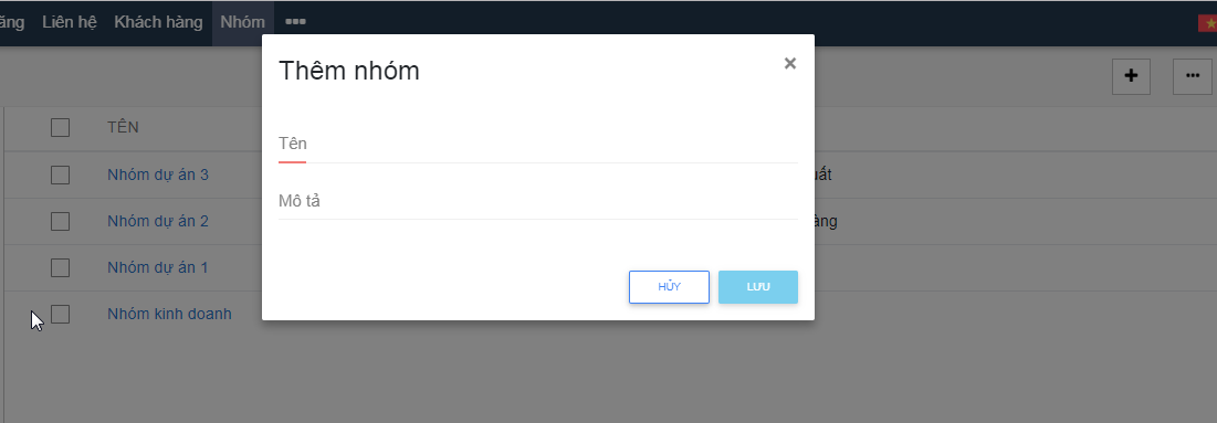 Kích chọn ô   màn hình hiển thị popup như hình  bên dưới. Điền đầy đủ thông tin hợp lệ vào các trường -> Kích button “Lưu” (Save) để lưu mới Nhóm (Group) , hoặc click buton “Hủy” (Cancel) để bỏ thao tác thêm mới và quay lại màn hình Danh sách Nhóm (List Group).