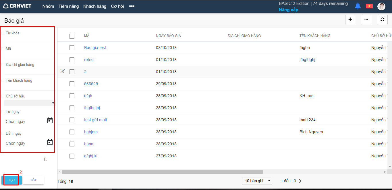 Tìm kiếm , lọc dữ liệu theo thông tin các trường của Báo giá ( Bao gồm tìm kiếm theo: Từ khóa, mã, địa chỉ giao hàng, tên khách hàng, chủ sở hữu, theo thời gian từ ngày-đến ngày)