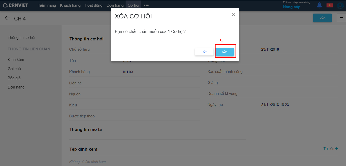 Thao tác để xóa cơ hội: Tại màn hình chi tiết cơ hội-> Click nút More-> Click nút Xóa cơ hội -> Xuất hiện pop up xác nhận xóa -> click chọn Xóa để xóa & click chọn Hủy để không xóa. (Hình 3,4)
